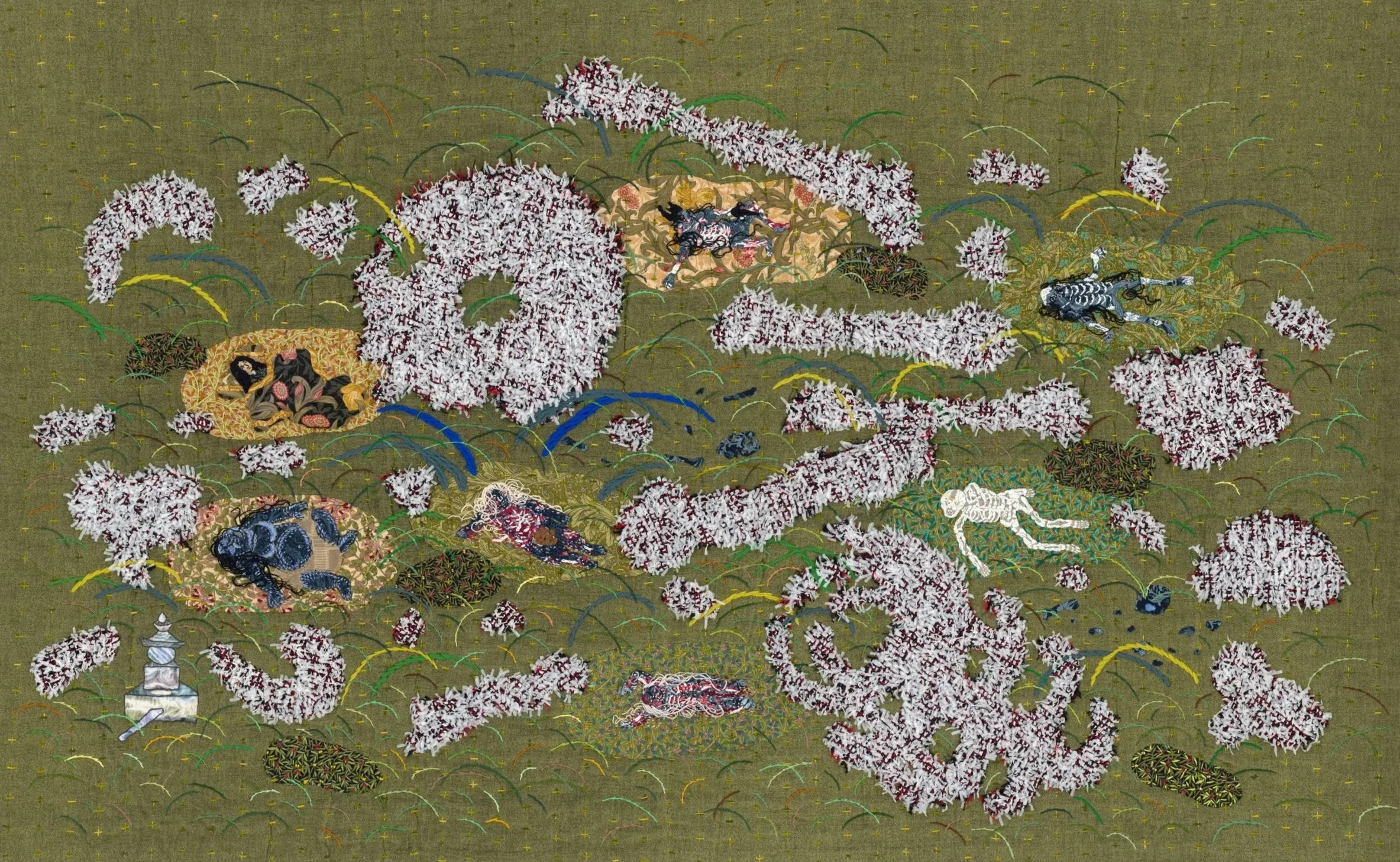 Ya Ting-Kao, flower of bones and shadows, 2026, cotton, wool, synthetic fibers, embroidery thread, yarn, glass beads, sequins, 34 1/4 x 55 1/2 in | 87 x 141 cm